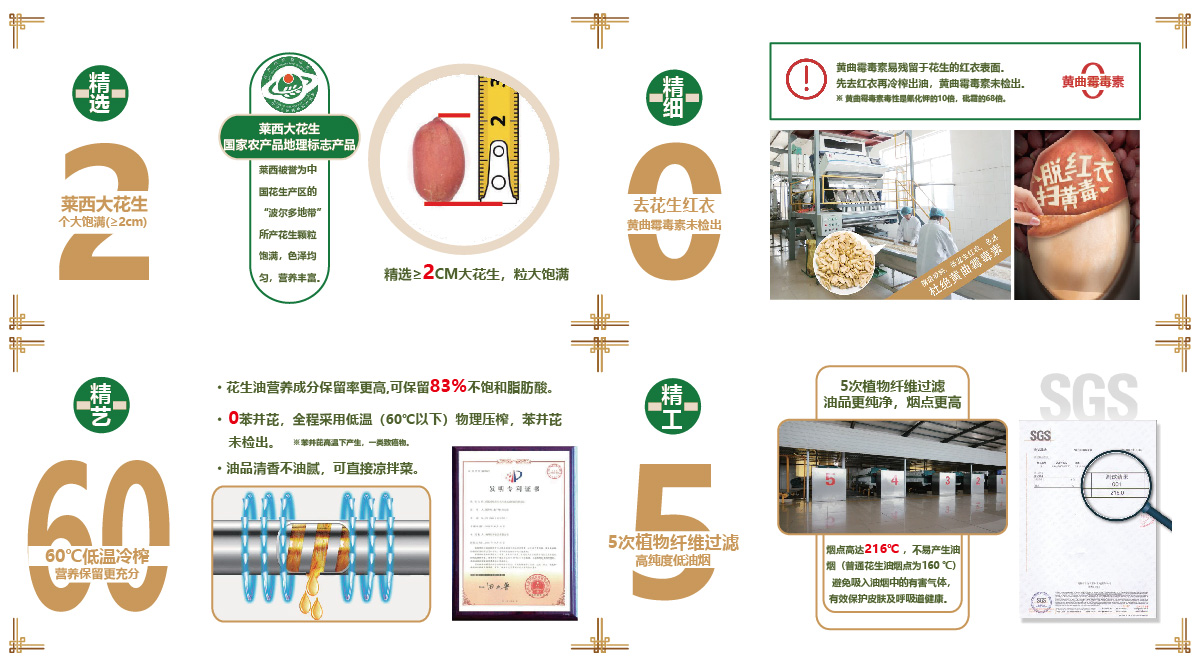 60°C 低溫壓榨,營養成分保留率更高(單不飽和脂肪酸、多不飽和脂肪酸、維生素、礦物質);精選出口級大花生,顆粒飽滿,營養豐富,黃曲霉毒素未檢出,衛生安全有保障。